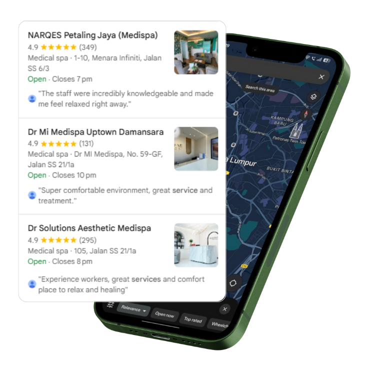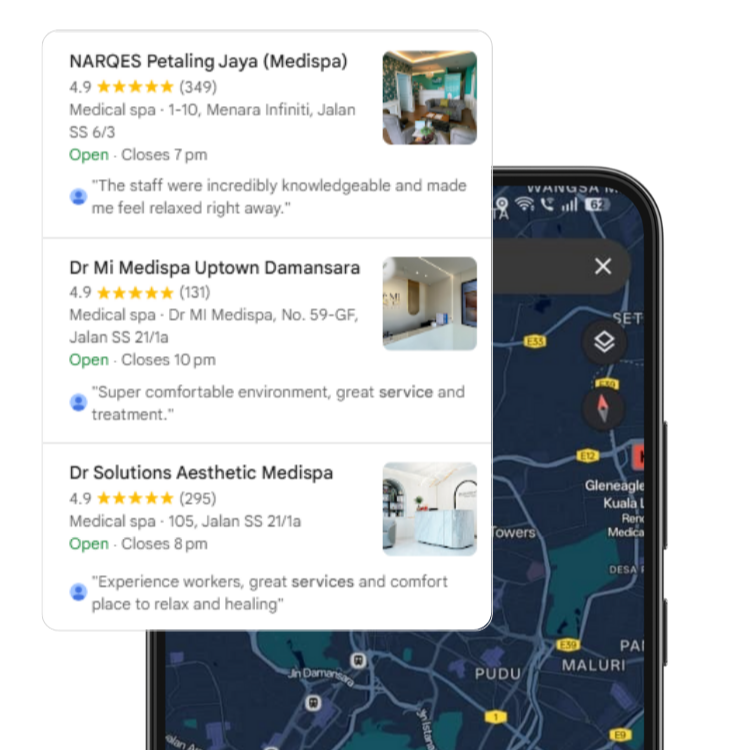 When someone searches “facial treatment near me” or “medispa in Kuala Lumpur,” your medispa should be right there at the top. Local SEO helps your business appear on Google Maps, get more bookings, and bring more clients through your doors.