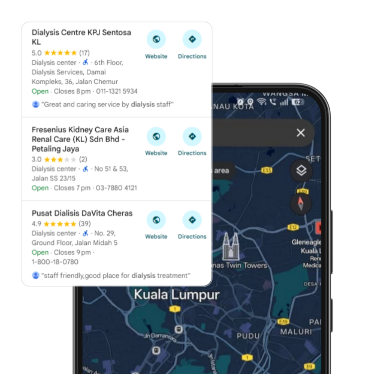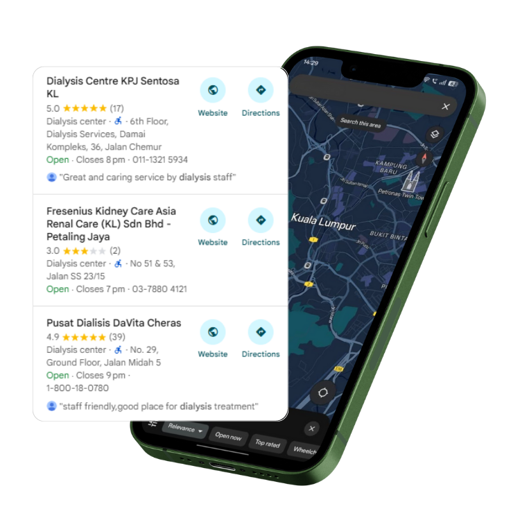 When someone searches “dialysis center near me” or “kidney treatment in Petaling Jaya,” your center needs to be right there at the top. Local SEO helps you appear on Google Maps, get more calls for appointments, and bring more patients through your doors.