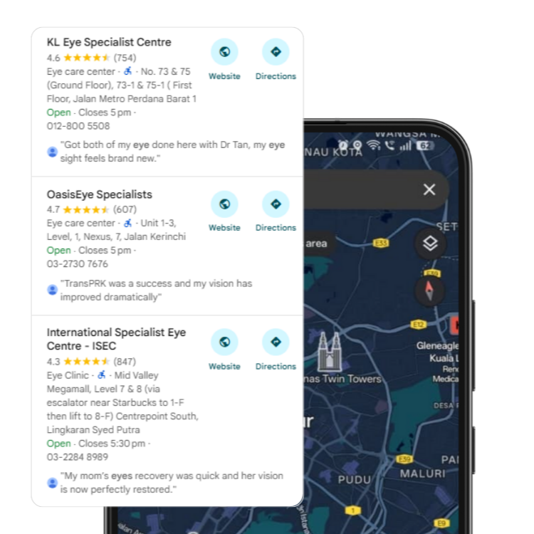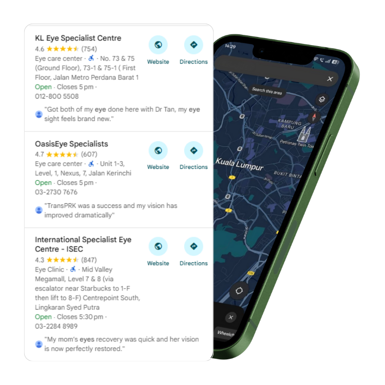When someone searches “eye specialist near me” or “cataract surgery in Petaling Jaya,” your clinic needs to be right there at the top. Local SEO helps you appear on Google Maps, get more appointment calls, and bring more patients into your practice.