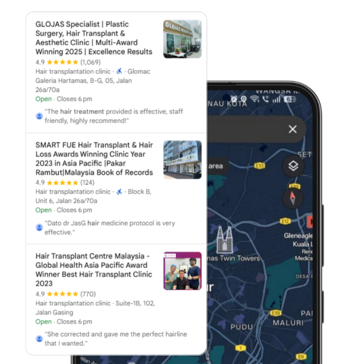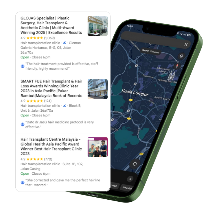 When someone searches “hair transplant clinic near me” or “FUE hair restoration in Kuala Lumpur,” your clinic needs to appear at the top. Local SEO puts your practice on Google Maps, drives more calls for consultations, and brings in patients ready to book their hair restoration journey.