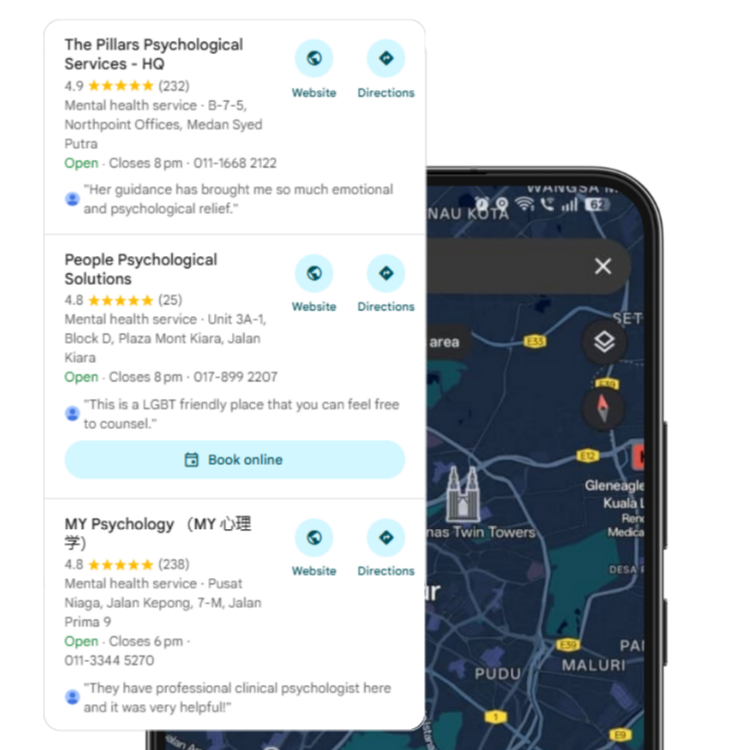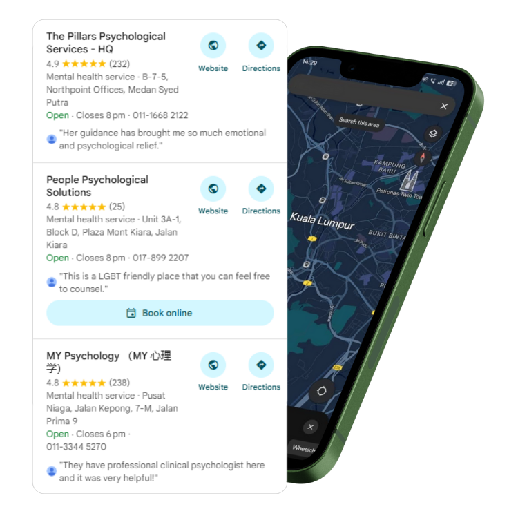 When someone searches “therapist near me” or “counseling in Petaling Jaya,” your clinic needs to appear at the top. Local SEO helps you show up on Google Maps, get more appointment calls, and bring more patients through your doors.