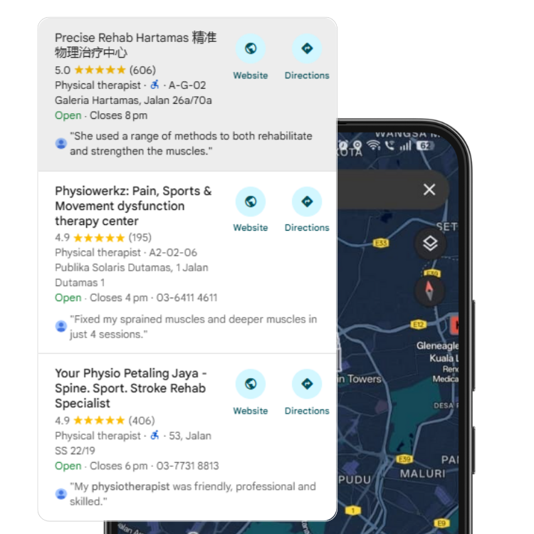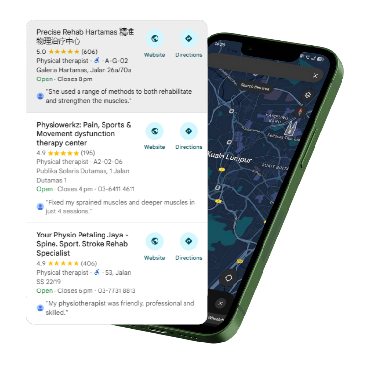 When someone searches “physiotherapy near me” or “sports injury rehab in Petaling Jaya,” your center needs to be right at the top. Local SEO helps you appear on Google Maps, get more appointment calls, and bring more patients through your doors.