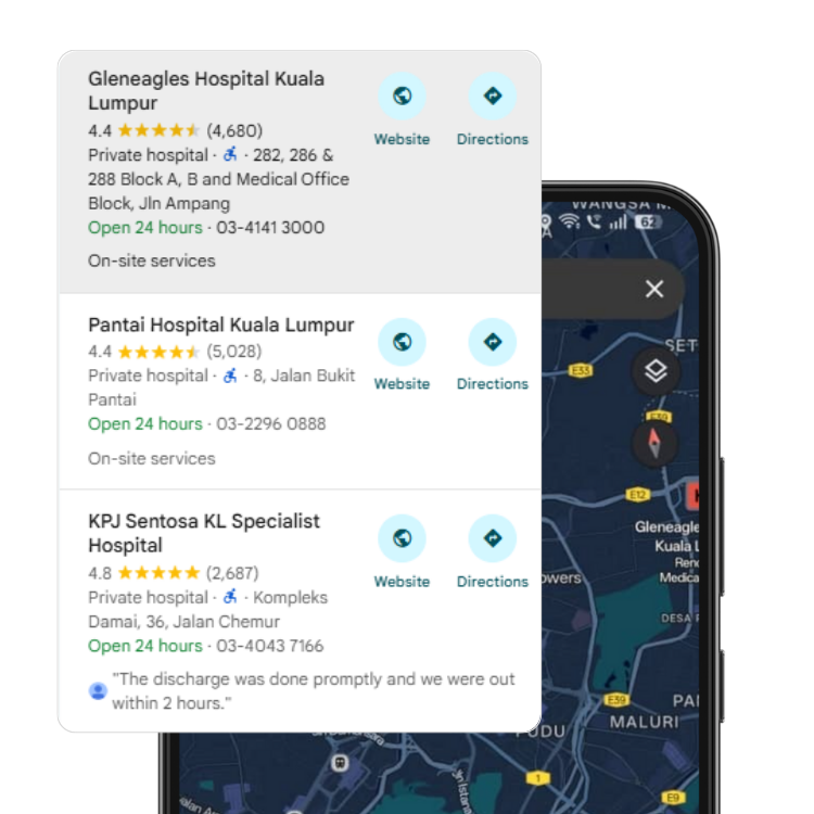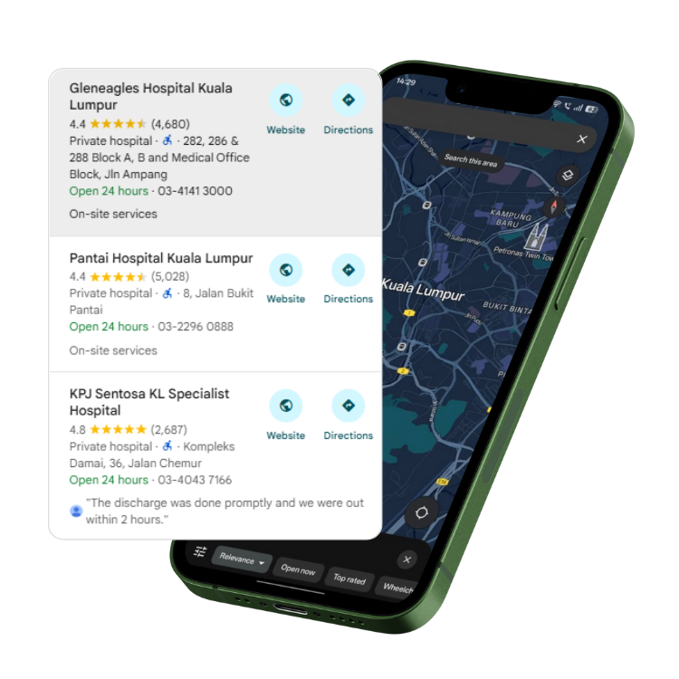 When someone searches “hospital near me” or “cancer screening in Kuala Lumpur,” your hospital needs to be right at the top. Local SEO helps you appear on Google Maps, get more appointment calls, and bring more patients through your doors.
